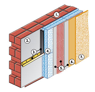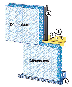 Wärmedämmsystem für den Fassadenbereich auf nicht genügend tragfähigen Untergründen, speziell im Altbaubereich. Mechanisch zu befestigen mit Sockel-, Halte- und Verbindungsschienen aus Spezial-Profilen. Aufwendiges Abschlagen des Altputzes sowie Untergrundvorbehandlung kann entfallen. Vorhandene Unebenheiten können mit Distanzstücken ausgeglichen werden.